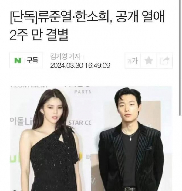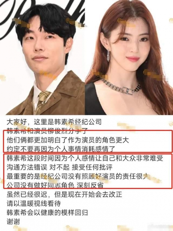 3月30日,据韩娱报道,韩素希柳俊烈确认分手了!距离两人公开恋情,才过去不到两周的时间。