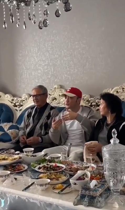 在照片中,尼格买提坐在父母中间,身着白色运动服,戴着一顶"应景"的红色帽子,看起来焕发神采。