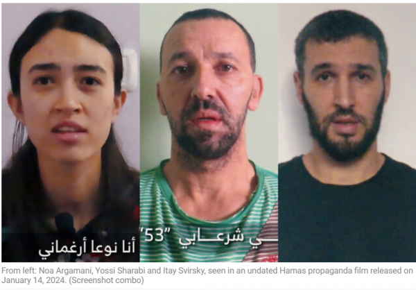 这段长约37秒的视频中出现了3名以色列人质,分别是诺亚、53岁的沙拉比(Yossi Sharabi)和38岁的斯维尔斯基(Itai Svirsky)。