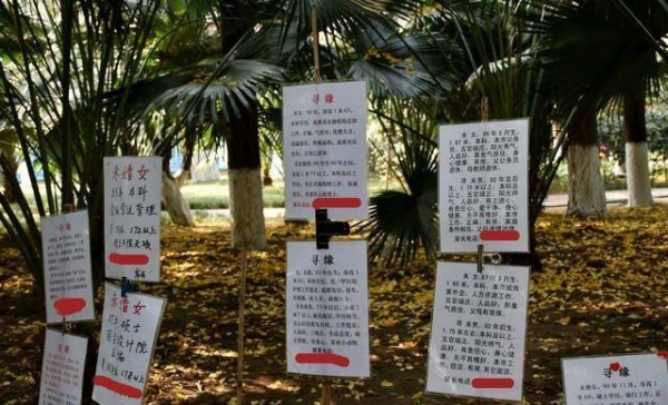 在中国,"相亲角"是一个特殊的公共空间,通常位于公园内。在这里,许多父母为未婚的儿女张贴个人资料,希望能为他们找到合适的配偶。