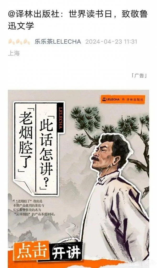知名奶茶品牌与出版社联名,鲁迅成"老烟腔"?网友:周树人同意了吗?