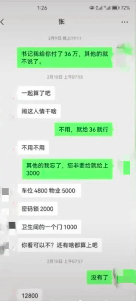 聊天截屏显示,闫某鹏对张玥说,"书记,我给你付了36万,其他的就不说了。"张玥说,"一起算了吧,闹这人情干啥。"