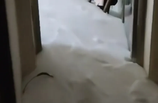 洗衣机里满满登登的也堆满了雪,户主称这一屋子雪和妈妈还有表哥从早上8点清理到下午3点才弄完,手臂酸痛的厉害。