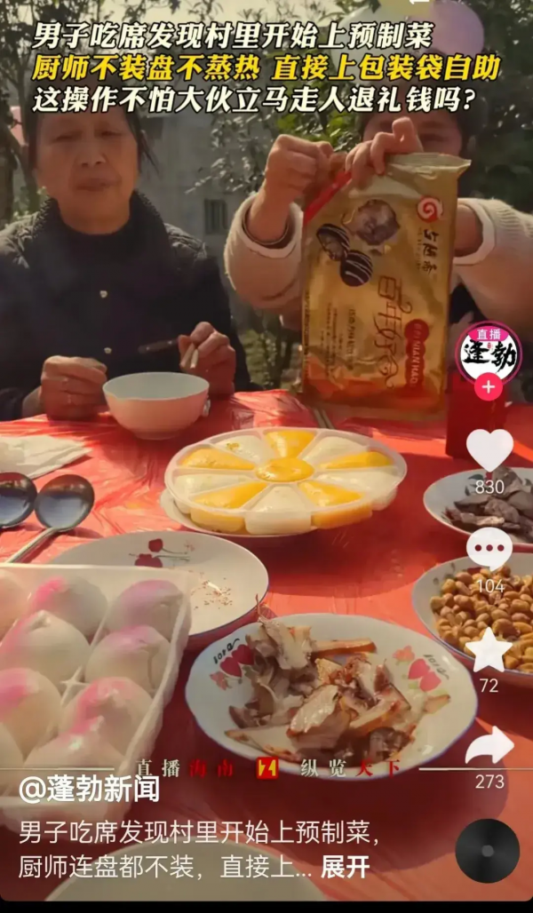 视频迅速在网络上引起了热议。有网友表示,这种做法虽然省事,却失去了乡村宴席的温度和人情味。也有人认为,这是对传统饮食文化的一种冲击,是现代生活方式对传统习俗的一次挑战。