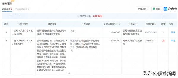 据企查查,幸卫林名下的"贵州视通国际旅行社",2023年曾两次遭相关部门处罚。去年7月贵州视通国际旅行社因未经许可经营出境旅游业务被罚款10000元。去年11月,该旅行社因旅游合同中未载明旅行社的签约地点;旅游行程中交通、住宿、餐饮服务安排及其标准;旅游者自由活动的时间和次数等信息,被罚款20000元。
