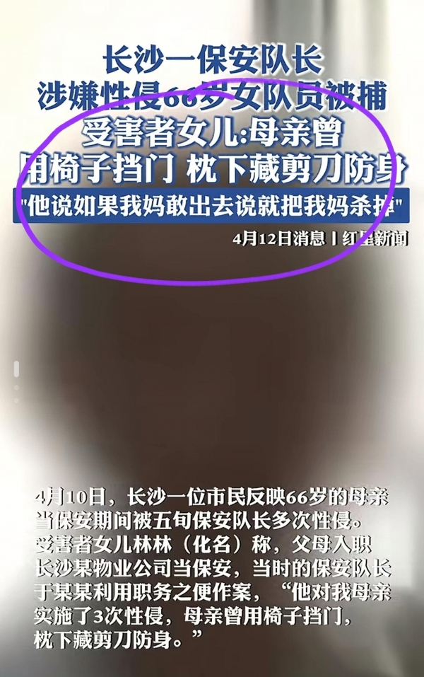 4月12日,长沙岳麓区某小区爆出荒唐新闻,小区53岁的保安队长涉嫌侵犯66岁的女保安队员,目前已经被逮捕!