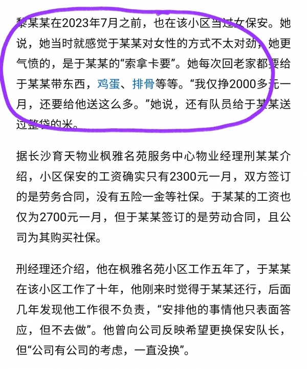 曾经有女队员投诉这个保安队长喜欢"索拿卡要",女队员的工资本身就2000多块钱,但保安队长却多次向她索要鸡蛋,排骨等物品送礼。