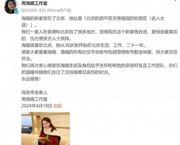 4月18日,周海媚工作室一早发文表示周海媚的"新家"定在了北京的天寿陵园。其主要原因是因为在这四个月的时间在香港一直没有找到合适的地方。想着姐姐生前比较喜欢北京,于是家人决定将其墓地定在了北京天寿陵园如意区名人大道,这样方便天南地北的粉丝前去祭拜