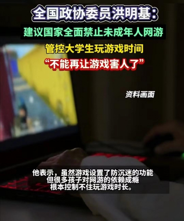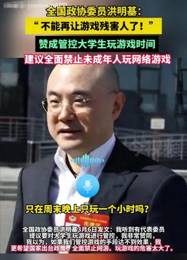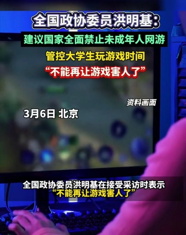 3月6日,参加两会的全国政协委员洪明基发布视频称:"不能再让游戏害人了!"他赞成管控大学生玩游戏时间,并建议全面禁止18岁以下的未成年人玩网络游戏。