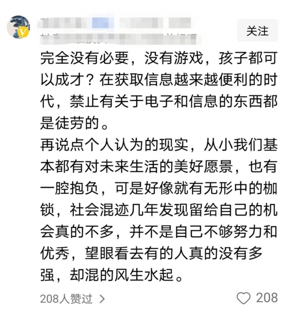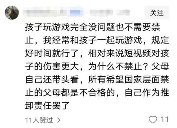 不过还有一个持反对意见的声音,认为没必要全面禁止网游,因为影响孩子的并不是网游,而是其家长没有正确引导,即便禁止了网友,还会有其他新事物吸引孩子们的注意力。