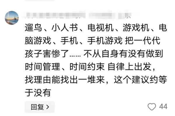 还有网友表示,这并不是网游的错,过去没有网游,但又其他的娱乐方式,比如遛鸟、小人书、电视机、游戏机等等,每一代都有具有时代性的娱乐方式,孩子还是会沉迷。