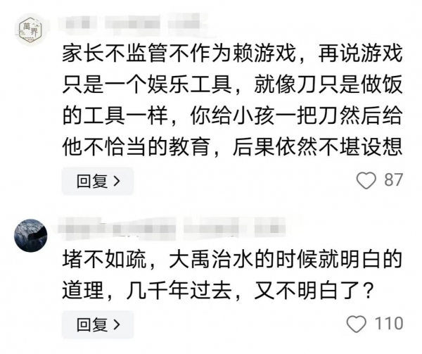 不仅如此,还有网友认为孩子沉迷网游跟家长有关。家长不监管不作为,不能赖游戏,而且游戏只是一个娱乐工具,就像厨房里的菜刀一样,你给孩子一把刀但又不告诉他怎么用,后果不堪设想!