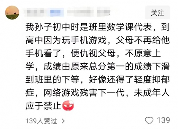 有网友表示,自己的孙子原本学习成绩不错,初中时还是班里的课代表,可是后来接触了网络游戏并沉迷其中。
