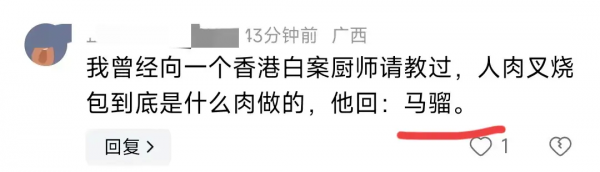 而还真的就有网友针对"人肉叉烧包"做了解释,称之前咨询过厨师,人肉叉烧包实际是什么肉做的,厨师回道:马骝。