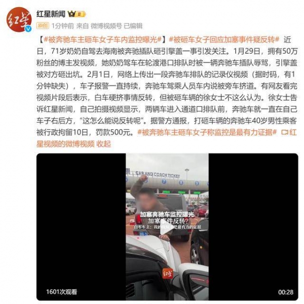 近日,71 岁奶奶自驾去海南被奔驰插队砸引擎盖一事引发关注。1 月 29 日,拥有 50 万粉丝的博主发视频,她奶奶驾车在轮渡港口排队时被一辆奔驰车插队辱骂,引擎盖被对方砸出坑。