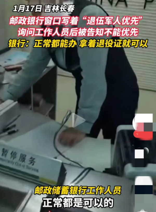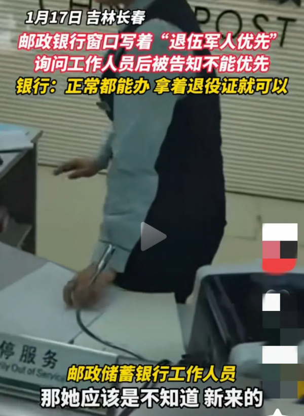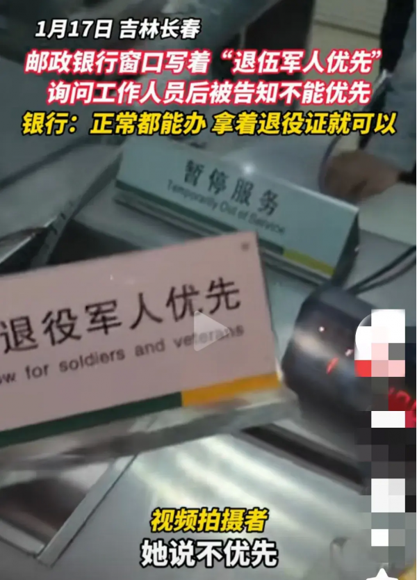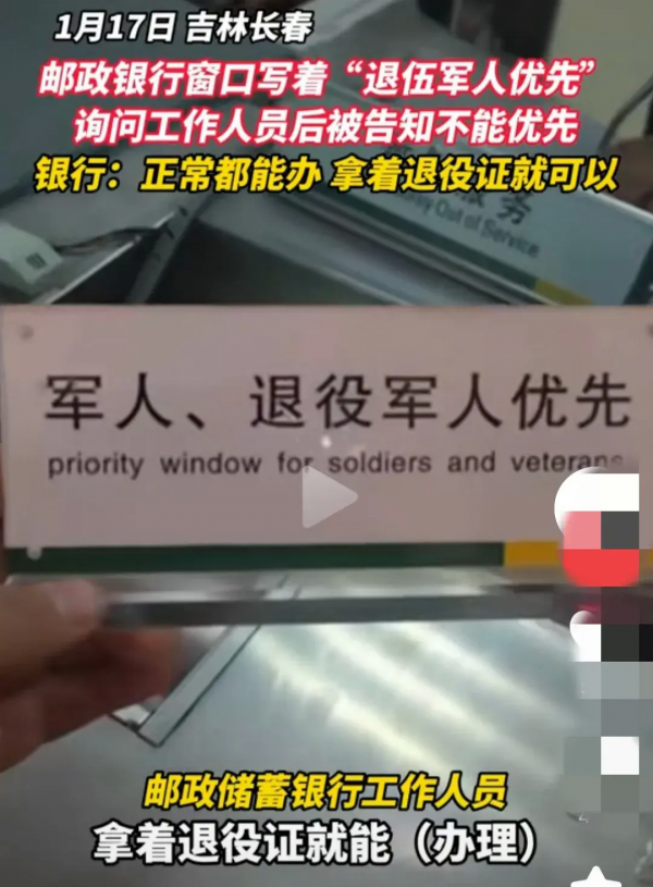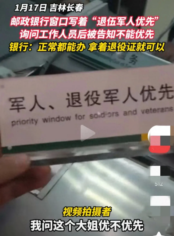 在网上流传的视频中,一位退役军人到邮政银行办理业务,看到窗口上摆放着一块"军人、退役军人优先"的牌子。于是上前向工作人员询问退役军人是否优先,结果工作人员答复不能优先。