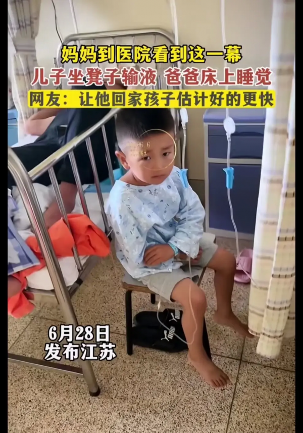 孩子光着脚丫坐在凳子上输液,爸爸舒舒服服的躺在床上睡觉,好气好气!