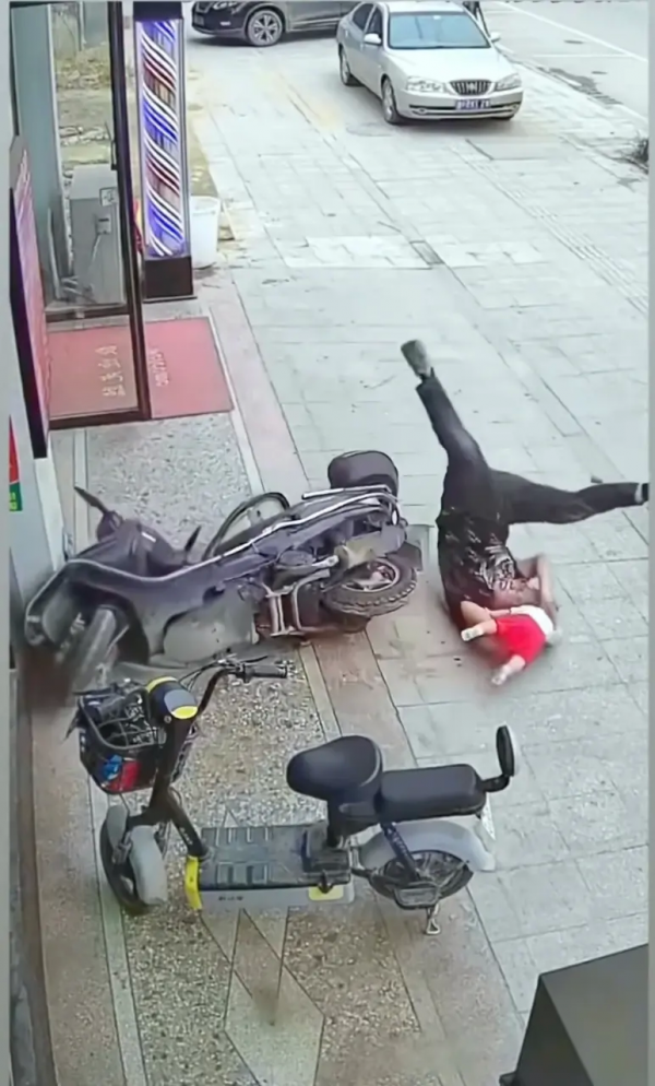 爸爸坐在摩托车上,一手抱娃,一手玩手机,摩托车翻倒了,爸爸带着娃叽里咕噜滚下来。