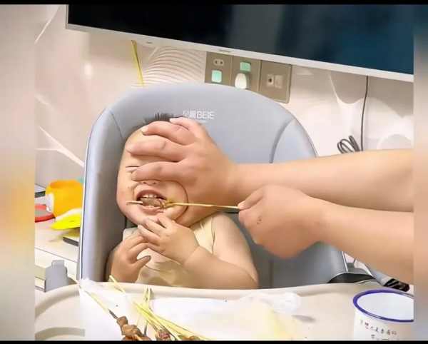 爸爸把肉串塞到宝宝嘴里,手动撸串,虽然但是,感觉还是有些危险。
