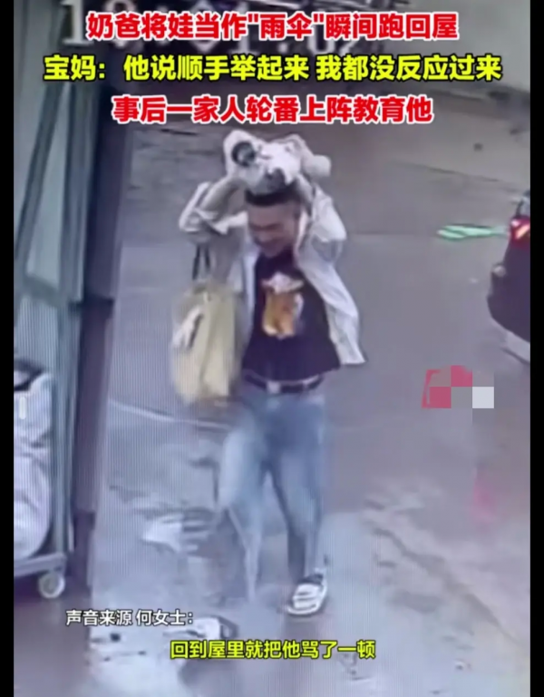雨天下车,新手爸爸顺势举起5个月大的宝宝给自己当雨伞,跑回了家。留下了下车撑开雨伞准备给宝宝挡雨的妈妈独自在雨中零落。回到家里,爸爸被一家人轮番教育。