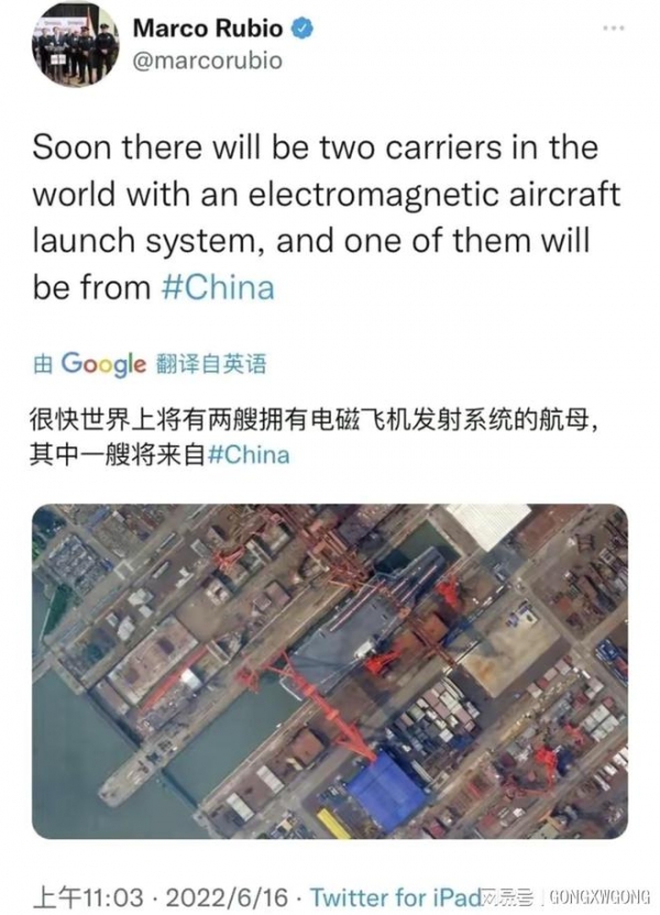 美国共和党反华议员卢比奥对中国航母"福建"舰电磁弹射技术发表的推特消息