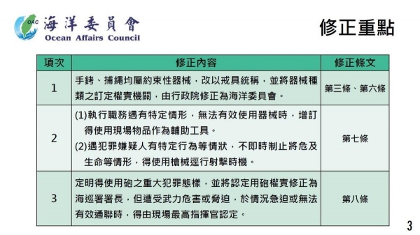 根据最新的规定,"海巡署"一线人员可以不经上级批准,自行判断是否要在执法过程之中,使用警棍、枪支等武器,且没有要求先鸣枪示警的硬性规定。使用火炮虽然仍旧需要得到上级批准,但相关使用限制也大幅减少,并给予了一线最高级别指挥人员,在人员伤亡、通信断绝等情况下使用的火炮的权力。
