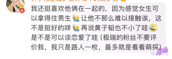 对于这样模棱两可的态度,有网友表示理解,但也有网友表示很不能理解,觉得恋爱了就大大方方承认,别总是传绯闻却不做出回应,也有网友表示理解,认为黄子韬毕竟30岁了,到了谈婚论嫁的年纪,正常情况,还有网友表示"这是人家自己的事情啊,人家那边一有风吹草动,这边立马热搜,你让人家怎么行动啊,而且,求婚是否,也是人家自己的事情,他想说自然会告诉大家,他不想说,干嘛强求呢! "