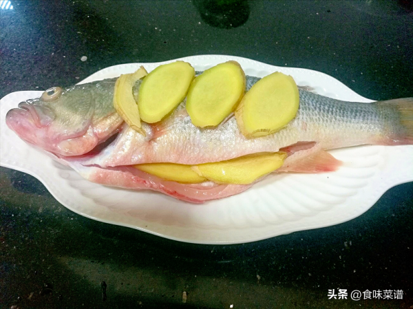1、准备一条新鲜的鲈鱼,让商家帮忙处理干净,把黑膜、鱼鳃都清理干净,这都是腥味的主要来源,放入姜片,淋入料酒,涂抹均匀,腌制一会儿,去腥入味。