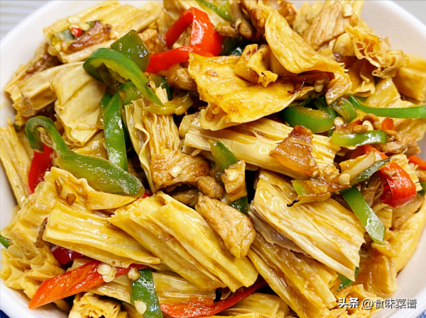 3、翻炒均匀,腐竹就可以出锅了,此菜鲜香美味,蛋白质丰富,营养丰富,颜值高,味道好,看着就很有食欲,过年吃腐竹,寓意一年"都富足,吃穿不愁"。