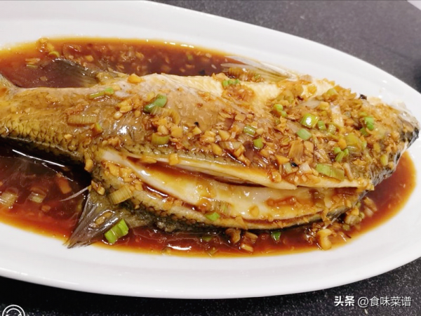 3、把煮好的料汁倒在鱼身上面,撒上一点葱花,就大功告成了,口感鲜嫩,好吃不腥,营养丰富,大人孩子都喜欢吃。