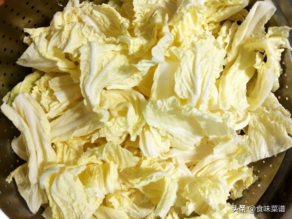 1、准备一颗大白菜,越鲜嫩越好,要挑汁水丰富的白菜,把外面的白菜帮扔掉,只保留较为鲜嫩的部分,不用清洗,不用刀切,用手撕成小块。