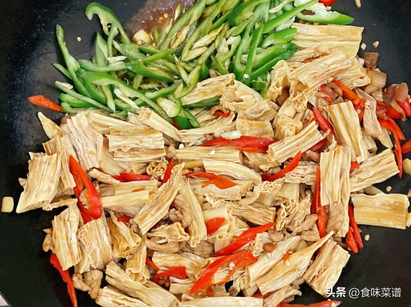 2、接着倒入提前泡软泡胀的腐竹,改刀切成小段,倒入锅中,一起进行翻炒,调味放生抽、蚝油、食盐,少来一些老抽,加入青椒丝,大火翻炒一分钟,加鸡精调味。