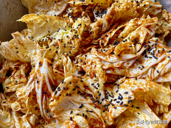 3、最后把白菜和料汁混合在一起,搅拌均匀,撒一把芝麻,乾隆白菜就制作完成了,一道很美味的凉拌小菜,爽脆鲜香,营养丰富,白菜意为百财,百财聚来的蕴意。