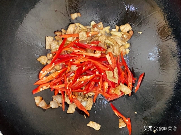 1、起锅烧油,油热倒入五花肉,用中小火煸炒,炒至变色,逼出油脂后,倒入大蒜和红椒丝,随便翻炒一下,炒香炒熟。