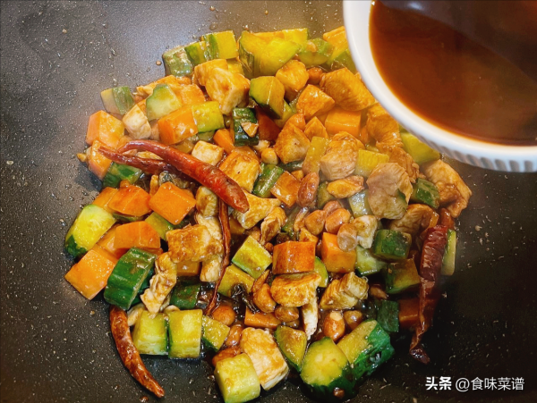 2、起锅烧油,倒入花椒、红辣椒爆香,接着倒入一勺郫县豆瓣酱,小火炒出红油,再倒入鸡胸肉、胡萝卜、黄瓜和花生米,翻炒一会儿,用糖,醋,酱油,盐、淀粉,加入3勺清水简单调一个料汁,倒入锅中。