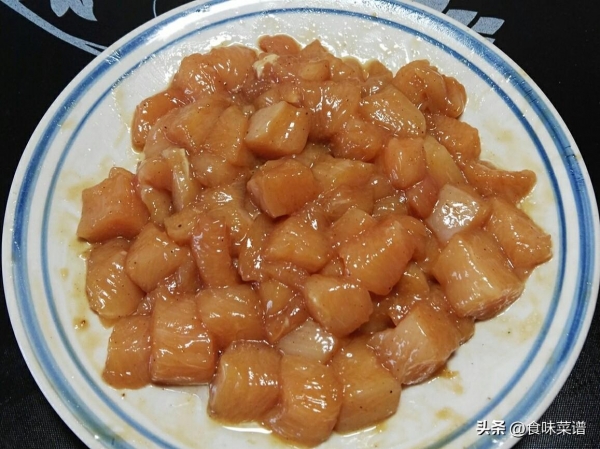 1、准备两块鲜嫩的鸡胸肉,改刀切成四方块,倒入料酒、生抽、食盐、玉米淀粉、芝麻香油,打入一个蛋清,注意只要蛋清,下手抓拌均匀,腌制半个小时。