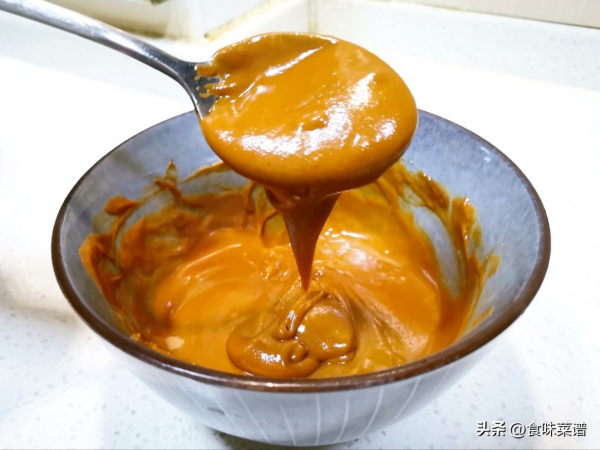 2、简单搭配一下料汁,碗中舀入2勺芝麻酱、2勺白糖、半勺蜂蜜、半勺老抽、2勺陈醋,1勺清水,用勺子顺时针搅拌均匀, 多搅一会儿,越细腻越好。