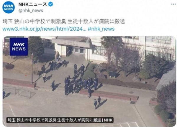 根据报道,埼玉县狭山市掘金中学上午8点20分向当地消防局报案,学校附近操场传出刺鼻臭味,有多名学生称身体不适。地方警方表示,现场有20多名学生出现喉咙痛、眼睛痛,其中10人已被送医治疗,据称症状较轻。