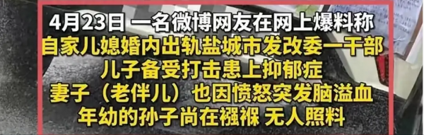 近日,一则公公举报儿媳婚内出轨的新闻冲上了热搜,网友爆料称:儿媳到发改委借调期间,与盐城市发改委新能源处处长宋某婚内发生性关系,儿子深受打击患抑郁症,妻子愤怒之下突发脑溢血,而刚出生没多久的孙子无人照顾。