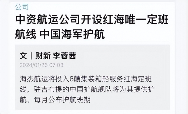相对应的,就在这场护航行动宣告失败的同时。有消息称,中资航运公司--海杰航运已于近期开设了红海唯一定班航线,由解放军亚丁湾护航编队提供护航,官方会每月公布护航班期。这相当于解放军不仅在亚丁湾现场,亲眼见证了美军的失败,更是用自己的实际行动,为美军演示了什么才叫正确的护航模式。