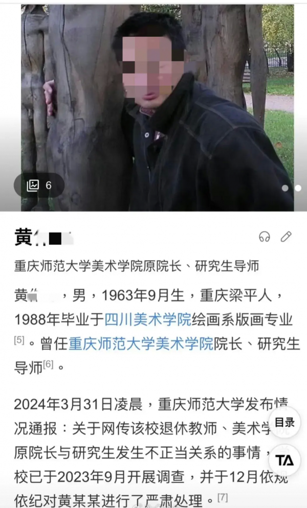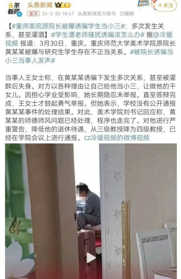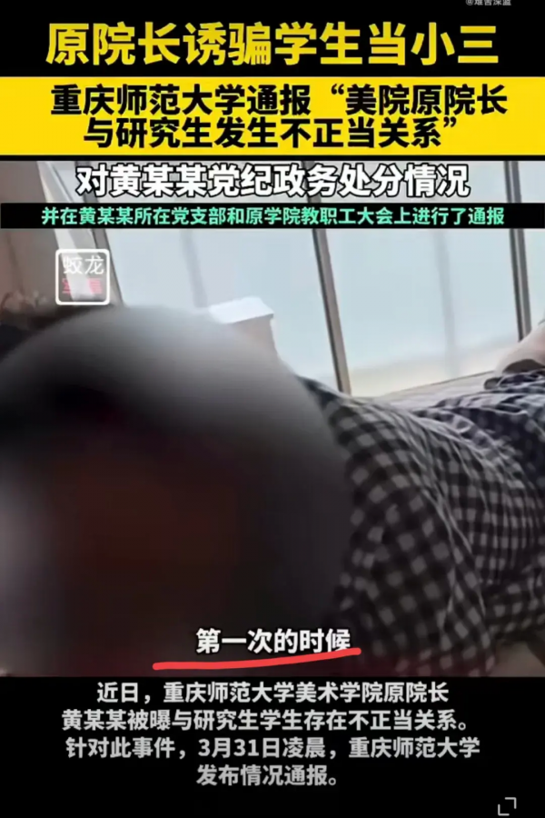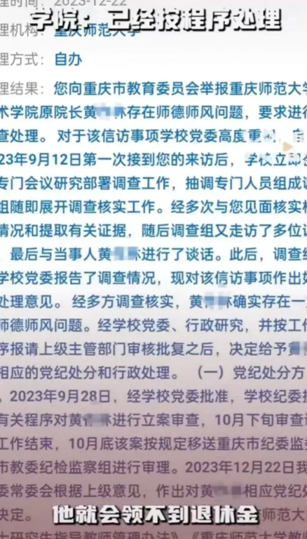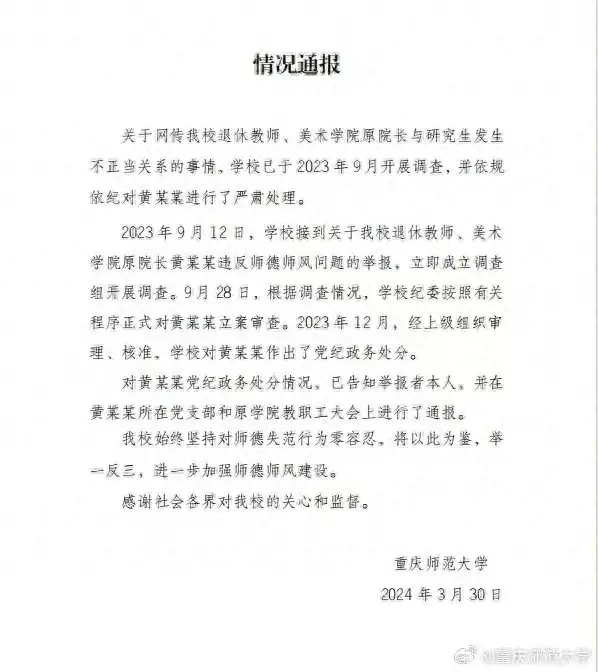 近日,重庆师范大学一则通报引起了网友的热议,通报内容是去年重庆师范大学一位退休教授、美术学院原院长黄某某违反师德师风问题的处理,并说处理结果已经通知举报者本人。