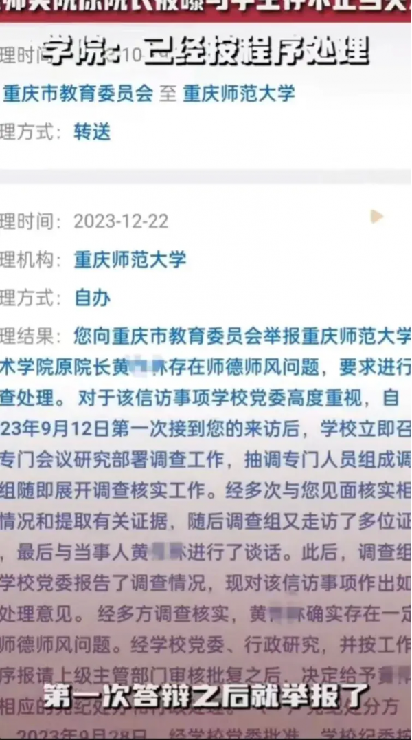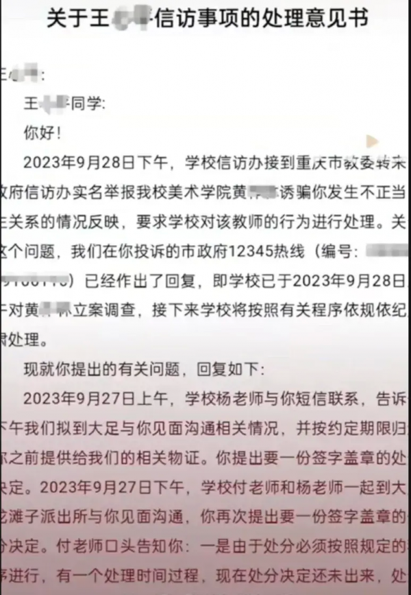 王女士最终还是决定把事情举报了重庆教委,9月28日教委把举报信转到重庆师范大学。