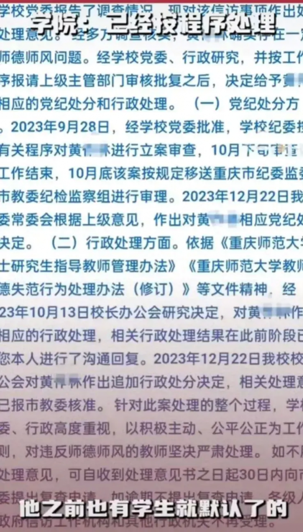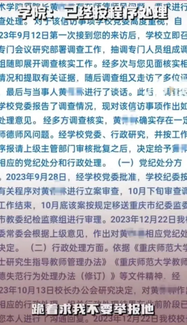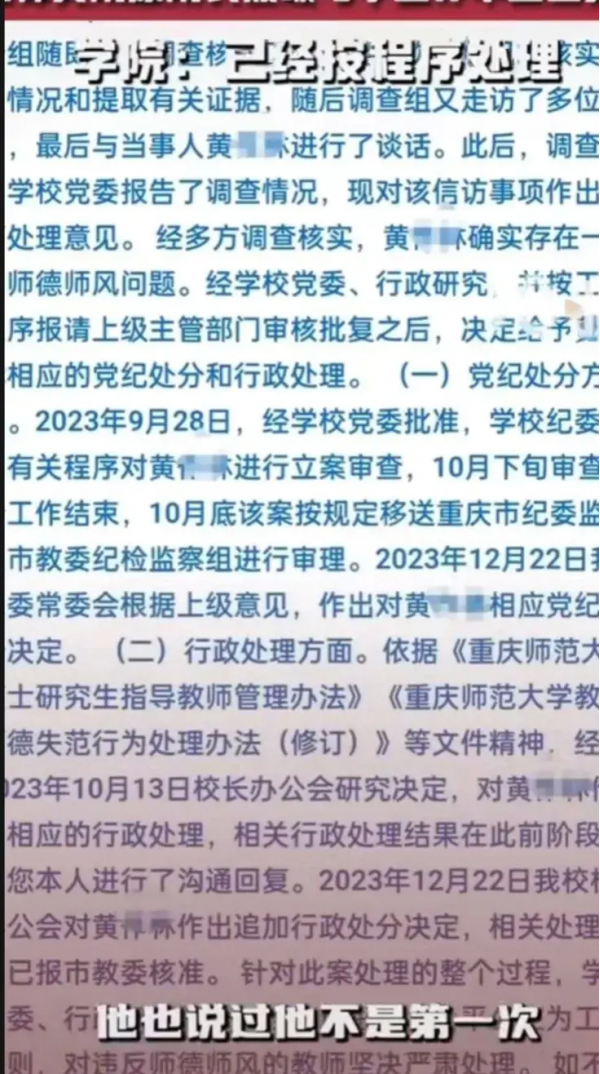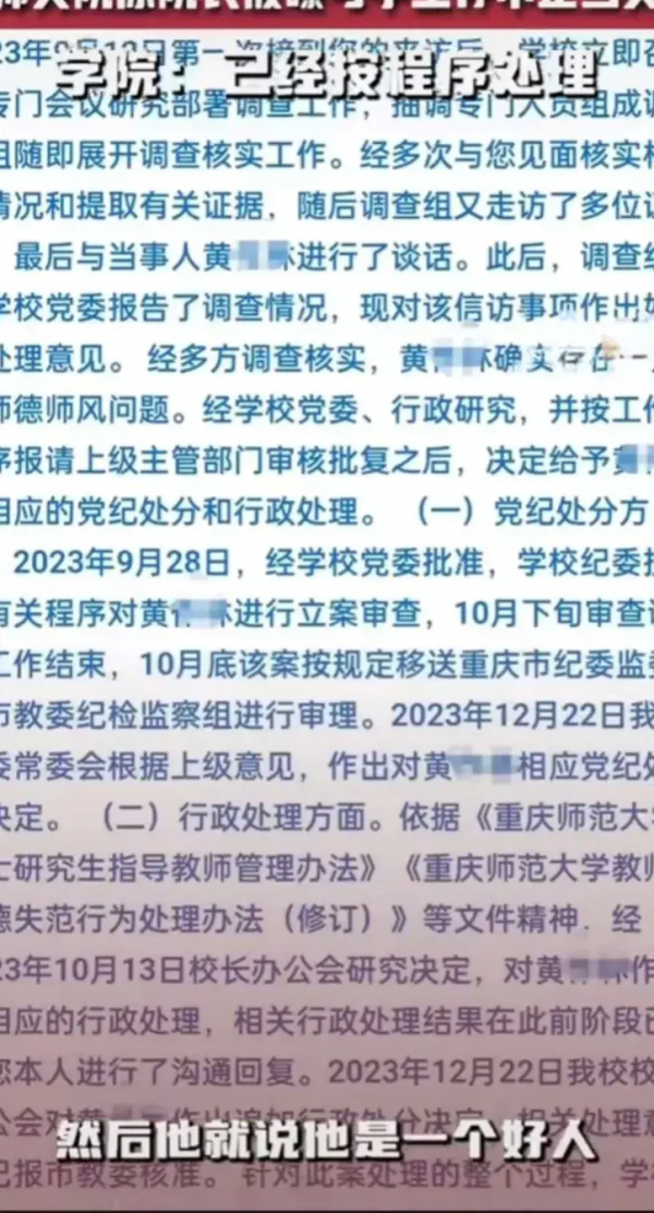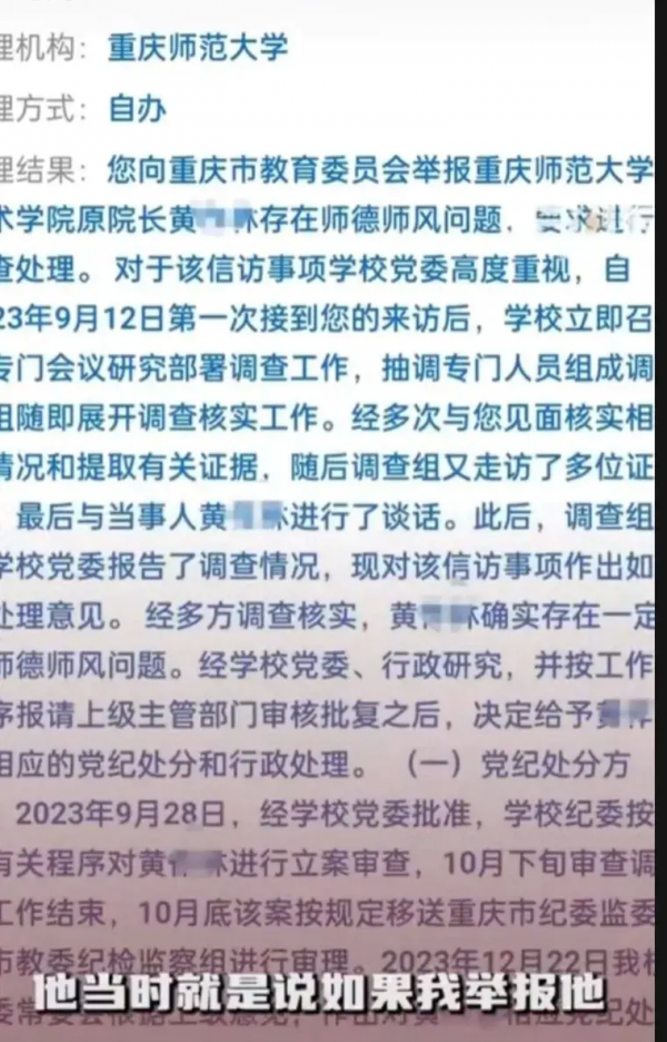 没想到,这份通报出来后,举报者本人,一位重庆师范大学女研究生王女士却表达了不同意见,她认为处理的太轻了。