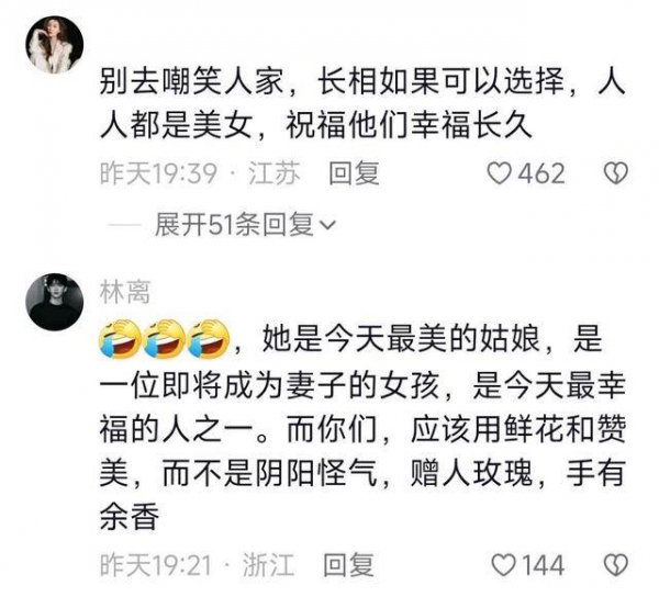 不要议论新郎的选择,当下他无怨无悔,最后,由衷希望这对新人能长久幸福,把自己的日子过好了,不让别人看热闹,就算对得起彼此当初的肯定。