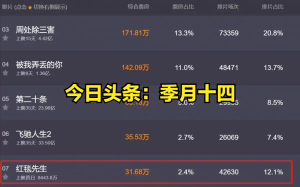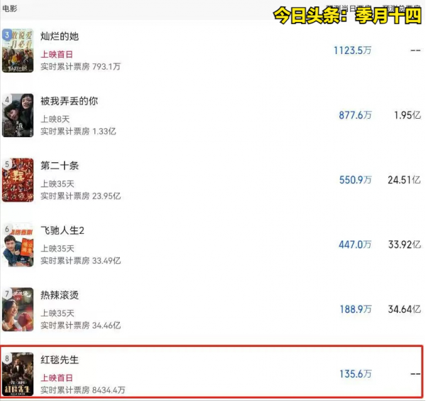 重新上映的第一天,观众们并未给予《红毯先生》以热情的回应。这部电影未能成为票房逆袭的黑马,甚至连日票房前五都未能进入。相比于春节期间的表现,这次的惨淡反响更加令人失望。