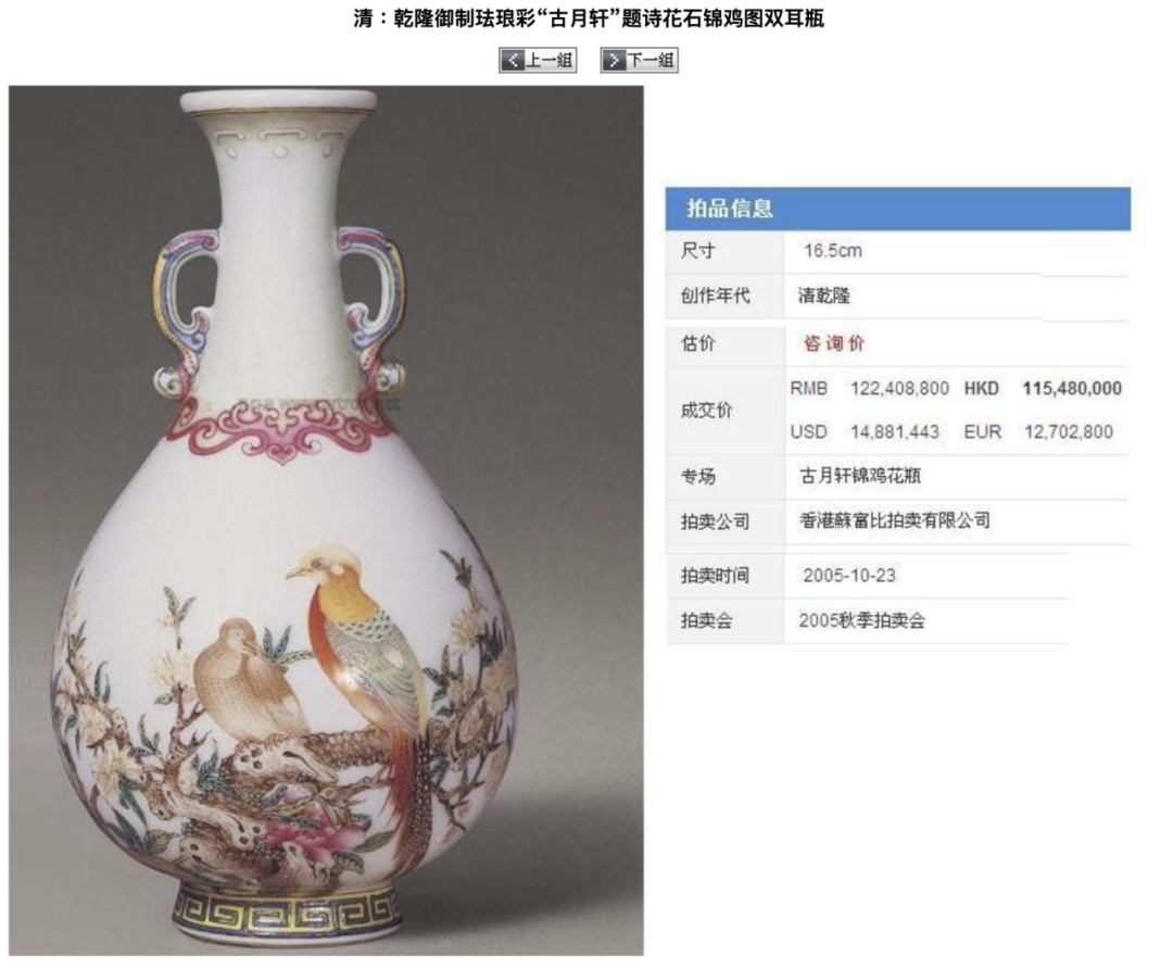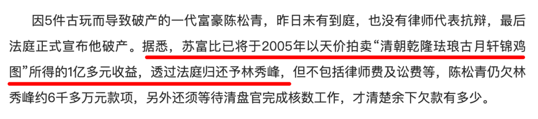 2005年,当初林秀峰借给佳宁集团充门面的5件古董中的"清乾隆御制珐琅彩'古月轩'题诗花石锦鸡图双耳瓶",以1亿多港币的天价出现在香港苏富比拍卖现场。得知此事后,林秀峰直接向苏富比发律师函,与陈松青由此展开第二回合缠斗......