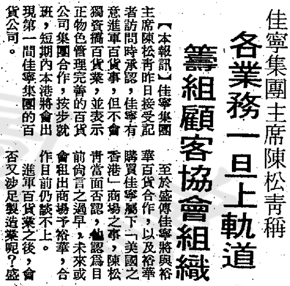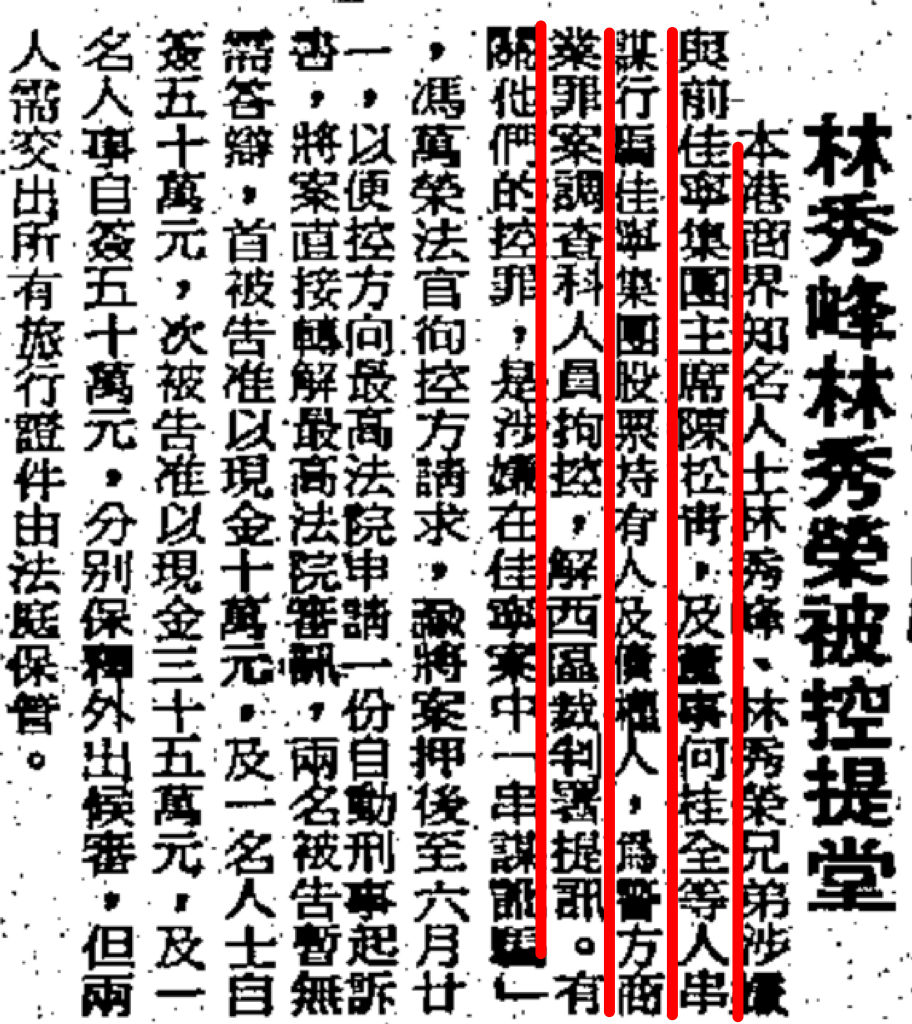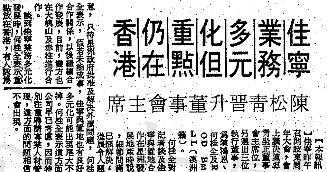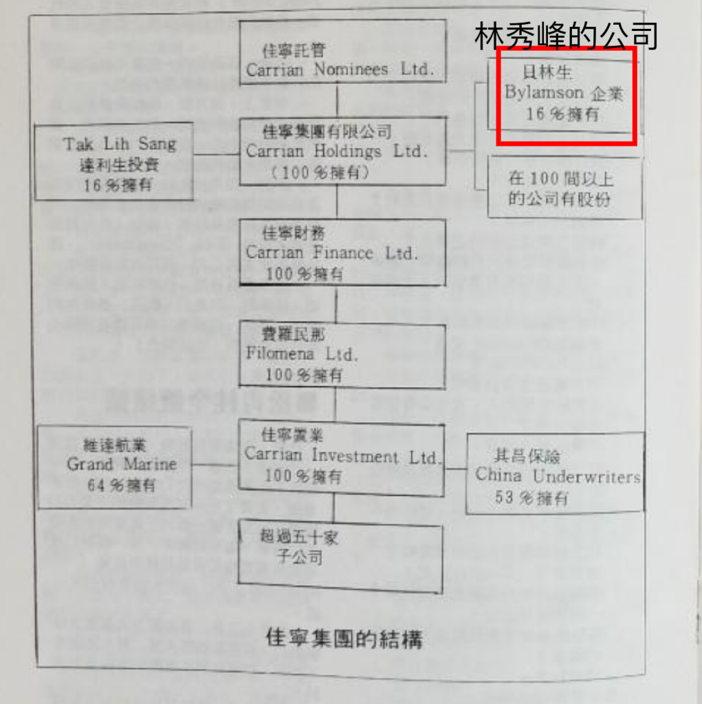 ▲ 林秀峰与佳宁集团的关系盘根错节,林不仅参与金门大厦虚假交易,入股佳宁集团,而且在股市市情惨淡的1982年8月,林秀峰在陈松青的建议下,斥9400万巨资买入一千三百万股佳宁集团旗下的其昌保险股票,"爸爸以前喺上海好钟意投资保险公司,我当时好希望将其昌当家族事业般经营落去"。结果1983年佳宁破产,林秀峰买入的1300万股佳宁股票化为废纸,一夜间输光大半身家。