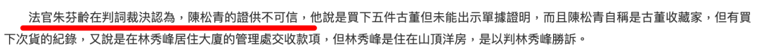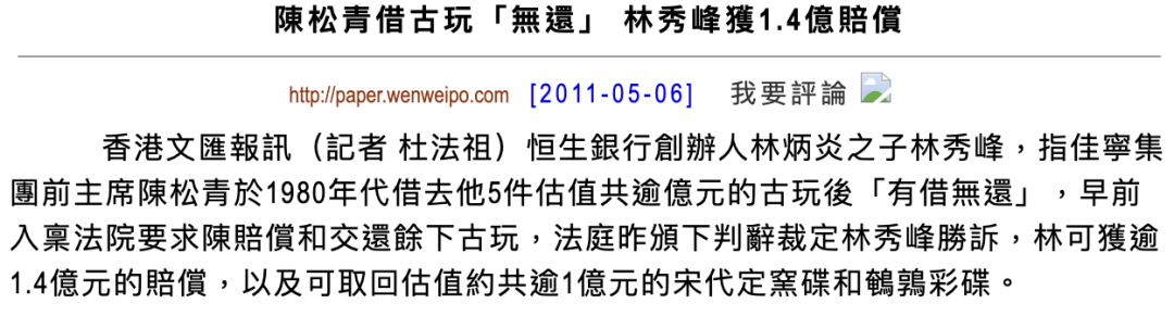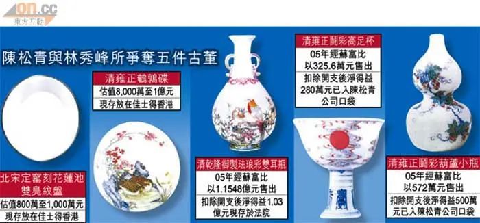 这桩官司从2005年一直持续到2011年,期间陈松青一口认定这5件古董是当年林秀峰卖给自己、而非借给自己,不过其证词中漏洞百出,多处自相矛盾,林秀峰胜诉。法庭最终裁定这5件古董系林秀峰所有,陈松青应物归原主,并须赔付林秀峰1.4亿。