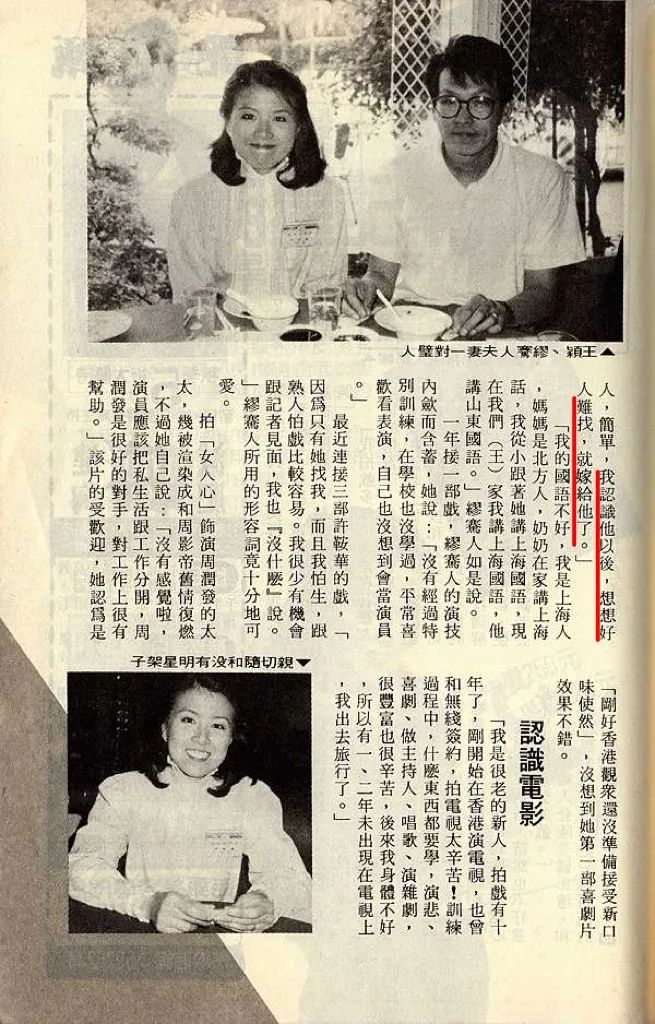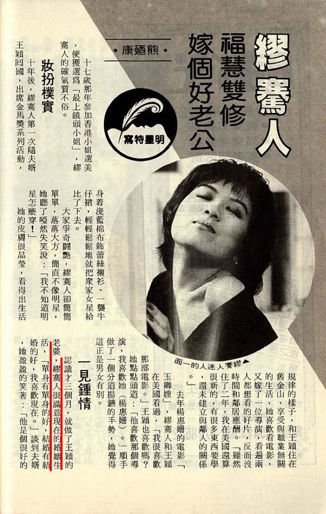 ▲ 最终一代女神远嫁美国,成为美籍华人导演王颖的妻子。王颖比较为中国观众熟知的电影作品包括周采芹(周采芹系出名门,父亲是京剧大师周信芳,这里可回顾周家的传奇往事)、俞飞鸿(我们也写过,这里可回顾)主演的《喜福会》,以及李冰冰、全智贤主演的《雪花秘扇》等。1986年,缪骞人凭借《最爱》夺得金马奖最佳女配角,1991年息影,专心在美国做起王太。