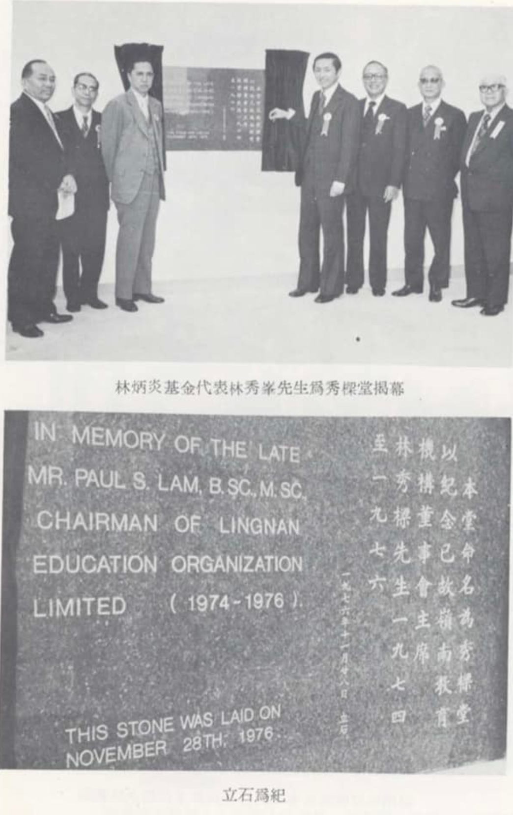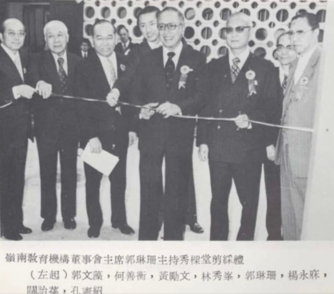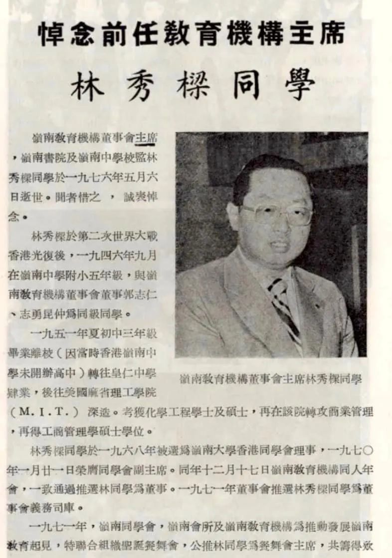 ▲ 林秀梁生前为香港岭南教育机构董事会主席,1976年林秀梁逝世后,校董会为表哀思,在征得林炳炎基金会的首肯后将新校舍命名为"秀梁堂"。从这则旧闻中可以看到,彼时林秀峰已是林炳炎基金会的代表。